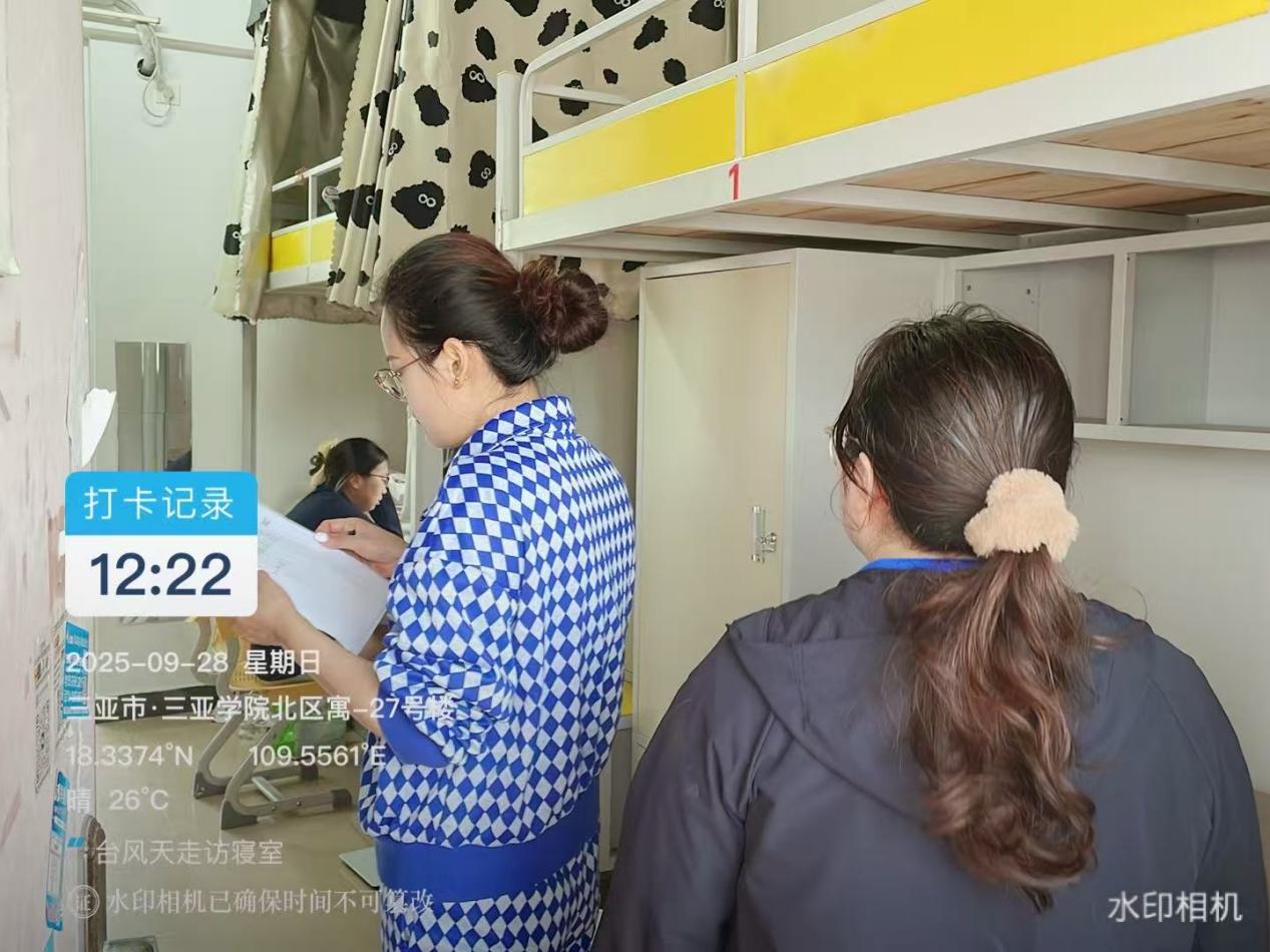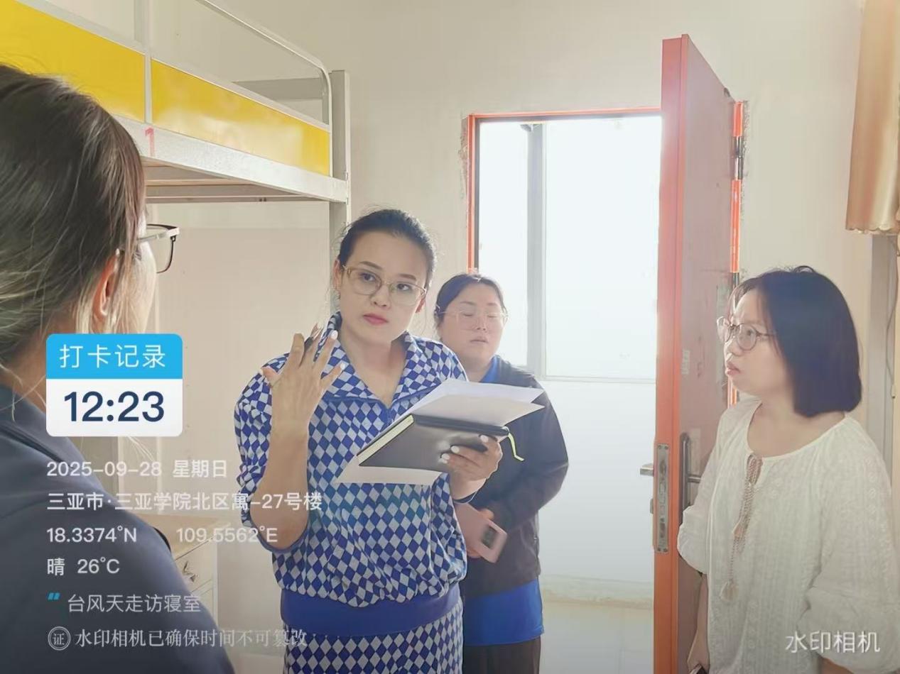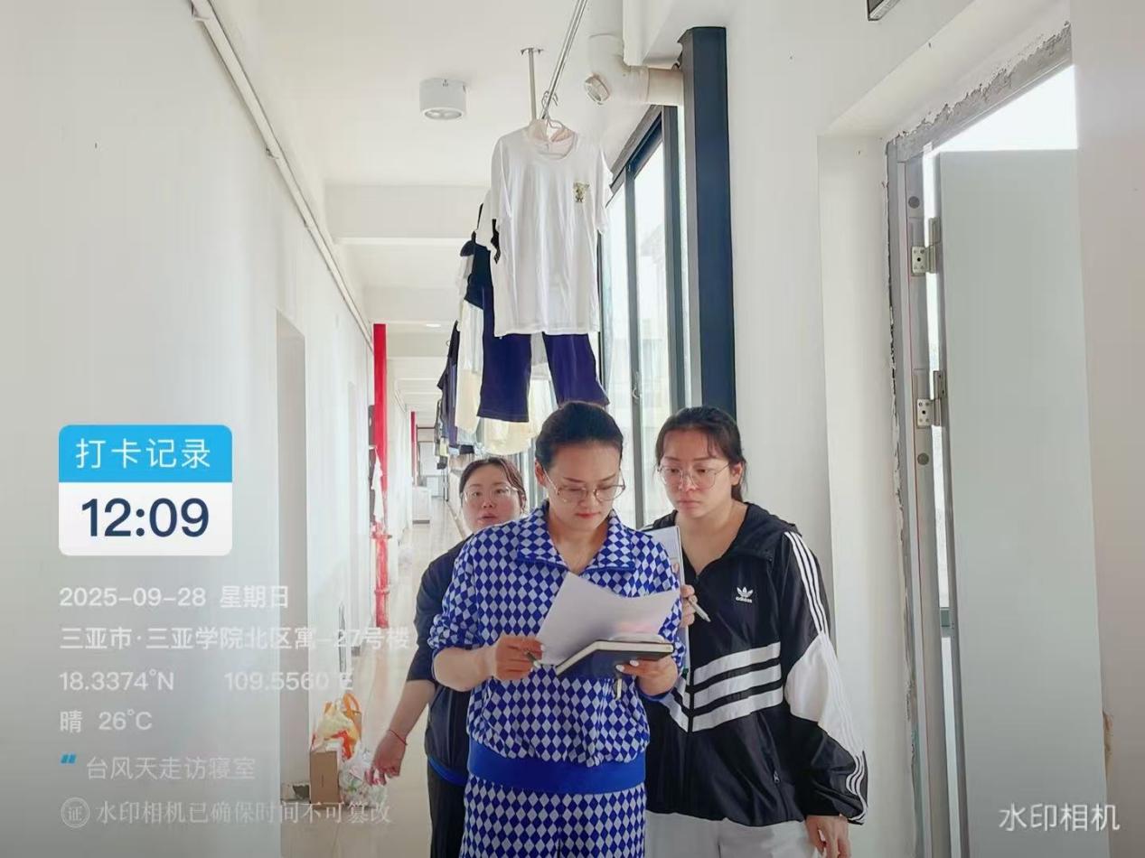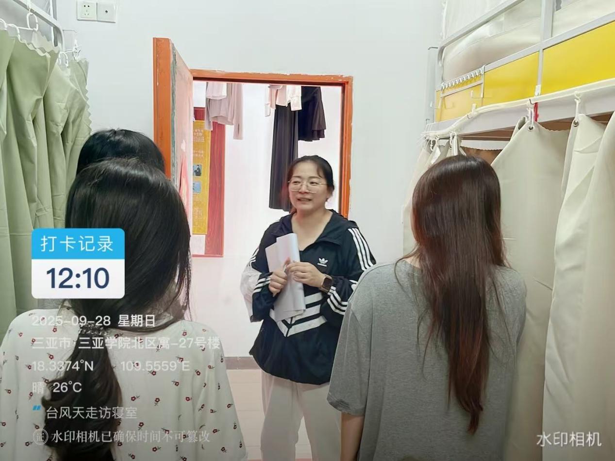 走访过程中,学院学工团队以“安全排查无死角、教育引导全覆盖”为目标,始终坚守工作一线。一方面,针对台风 “博罗依” 带来的风雨影响,老师们再次细致检查宿舍门窗稳固性、阳台物品摆放情况,反复提醒学子关闭闲置电源、储备应急物资,详细讲解台风期间避险要点,同时耐心安抚首次远离家乡面对极端天气的新生情绪,及时解答大家关于停课期间学习安排、生活保障的疑问,用专业指导提升学子防台应急能力,用温暖关怀驱散学子思乡焦虑,让校园成为学子的 “安全港湾”。