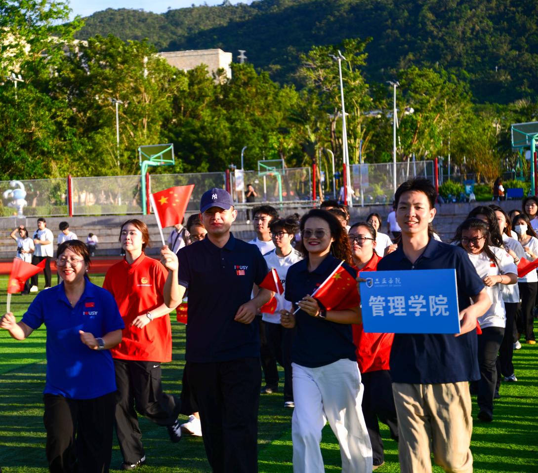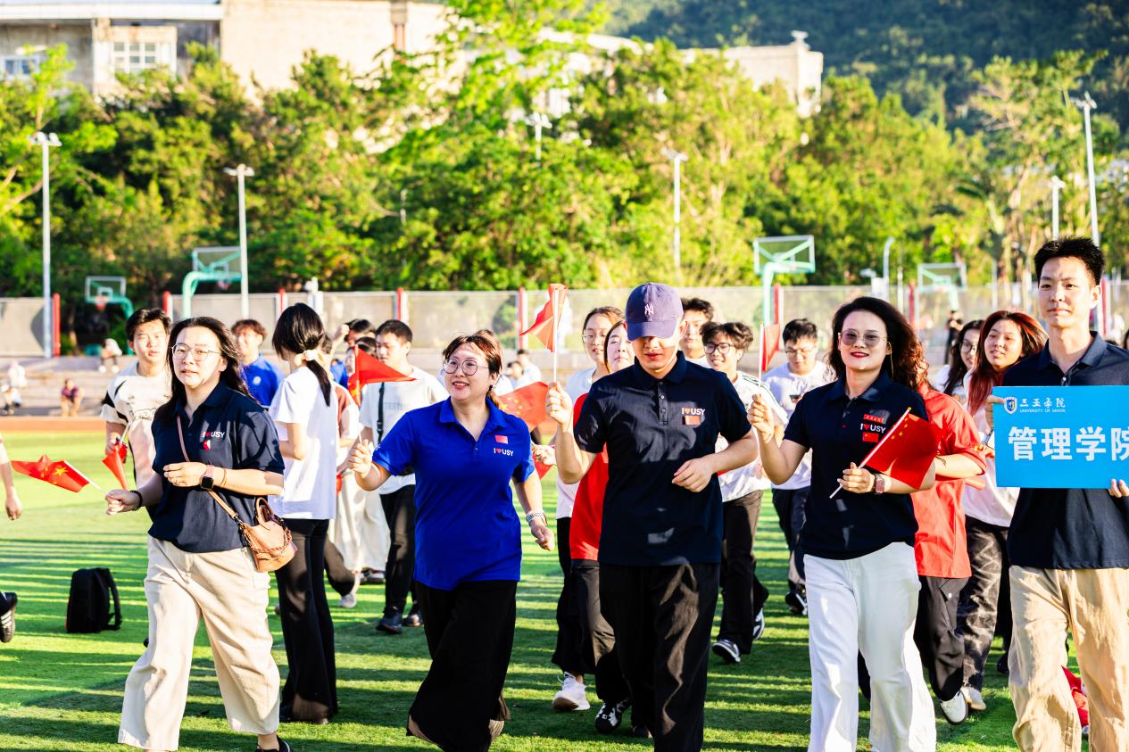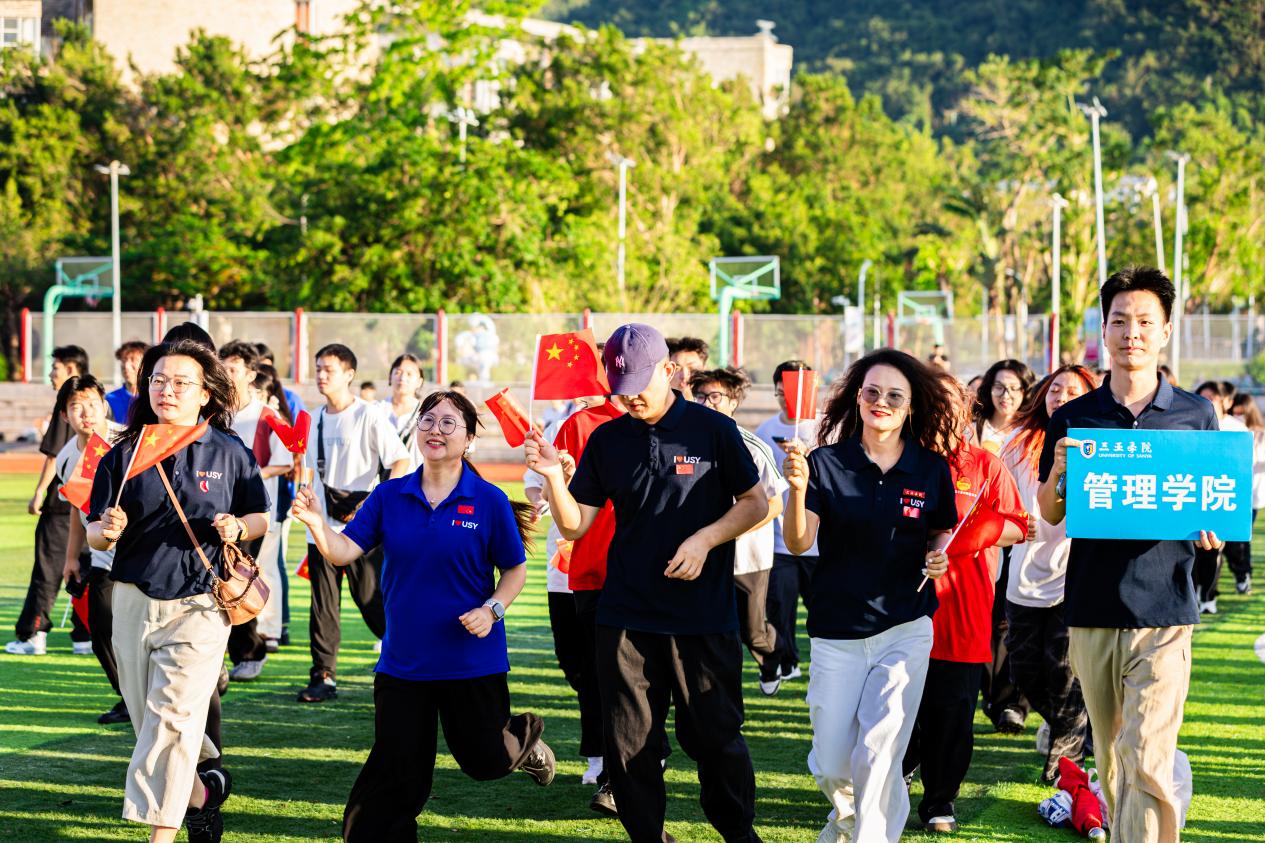 仪式第五项,师生共庆国庆健康跑。随着开跑音乐,老师同学们按照预定的路线绕场奔跑,全场的气氛瞬间变得热烈而充满活力。队伍步伐整齐,脚步声与青春呐喊交织,师生们以昂扬姿态向前奔跑,用蓬勃朝气诠释着新时代管院人的担当,为祖国华诞献上最富活力的青春礼赞。