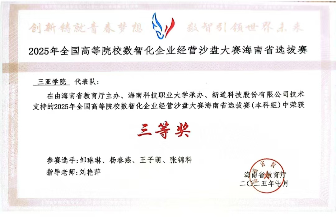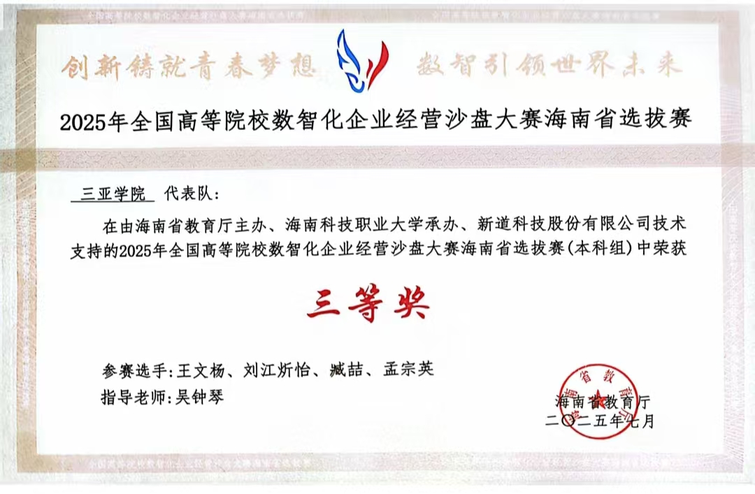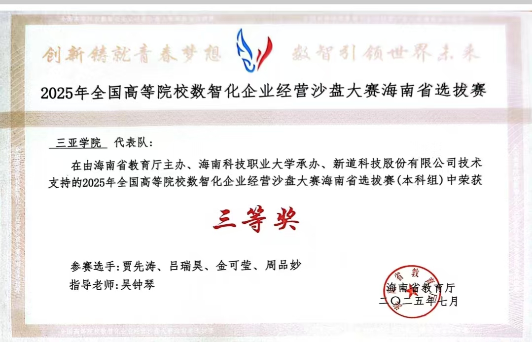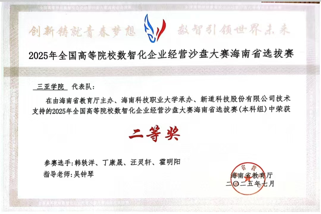 本学年,我院学子在各类学科竞赛中硕果累累,其中,在2025年5月9日至10日,在海南科技职业大学美兰校区举办的2025年全国高等院校数智化企业经营沙盘大赛海南省(本科组)选拔赛中,由刘艳萍等老师带领的工商管理专业和物流管理专业4支队伍经过激烈的角逐,共斩获二等奖1项,三等奖3项。