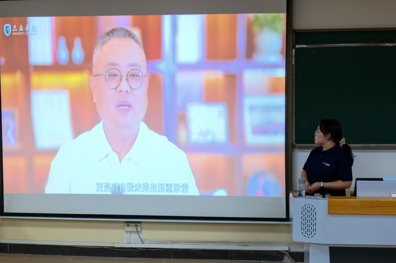 课程伊始,新生们集体观看了校长沈建勇教授为2025级新生主讲的“开学第一课”视频。视频中,沈建勇校长以真挚情感欢迎新生加入三亚学院(USY)大家庭,更勉励青年学子立足“强国有我”的时代坐标,用智慧积淀与创新实践,筑牢为国家建设发展贡献力量的根基,话语间满是对新生的期许。