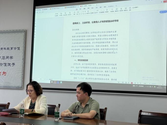 会议伊始,院长王云凤教授首先对新入职的教师表示了欢迎,公布了学院的人事变动。党总支副书记陶信伟通报了近期学院在招生、迎新准备等方面的进展情况。会议核心环节,全体教师集中学习了陆丹理事长在理事会上的讲话与《USY 办学结构性调整改革总体方案》。王云凤院长结合学院的学科特色、教学现状及发展需求,对两份重要文件进行了细致解读,并就如何贯彻落实学校结构性调整改革方案进行了全面部署。