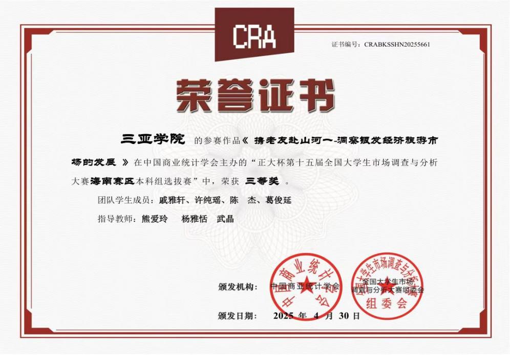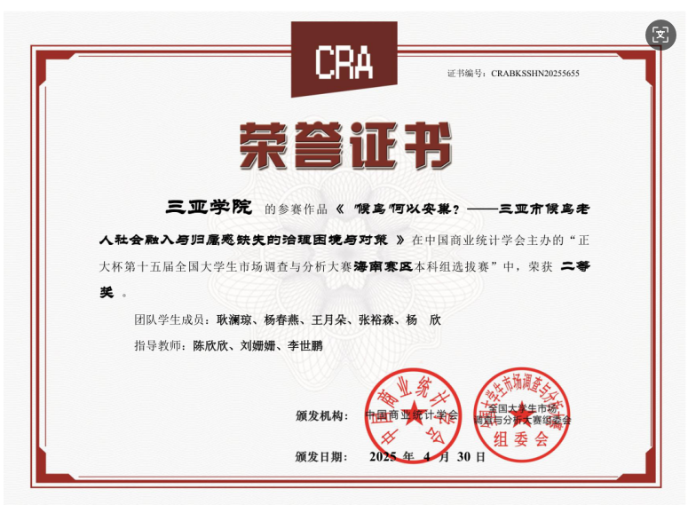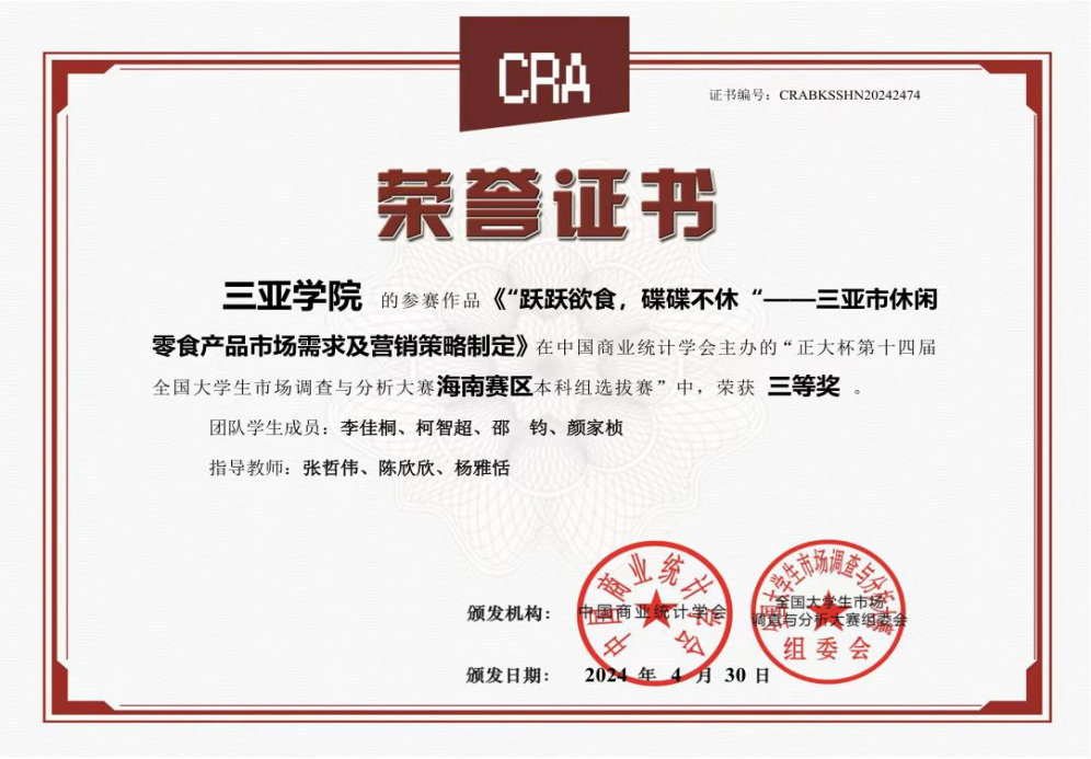 HRM协会多名成员在2024年、2025年“正大杯”第十五届全国大学生市场调查与分析大赛校赛中荣获特等奖,海南省赛二等奖、三等奖