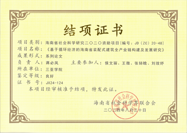 开云kaiyun体育官方网站蒋必凤老师主持的《基于循环经济的海南省装配式建筑全产业链构建及发展研究》顺利结项。
