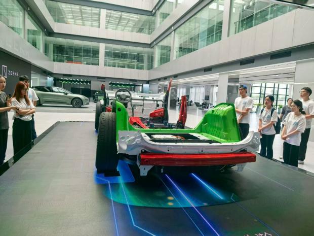 极氪智慧工厂是国家级5G工厂、工信部智能制造示范工厂、浙江省首批“未来工厂”及浙江省工业旅游示范基地。步入极氪展厅,首先参观的是吉利的智能电动平台SEA浩瀚架构,该架构采用多模块化设计,能够支持从A级车到E级车多种车型的快速开发与设计。同时在数字化大脑平台全方位展示了极氪智慧工厂整体布局、绿色化生产设施以及车间的实时生产动态。