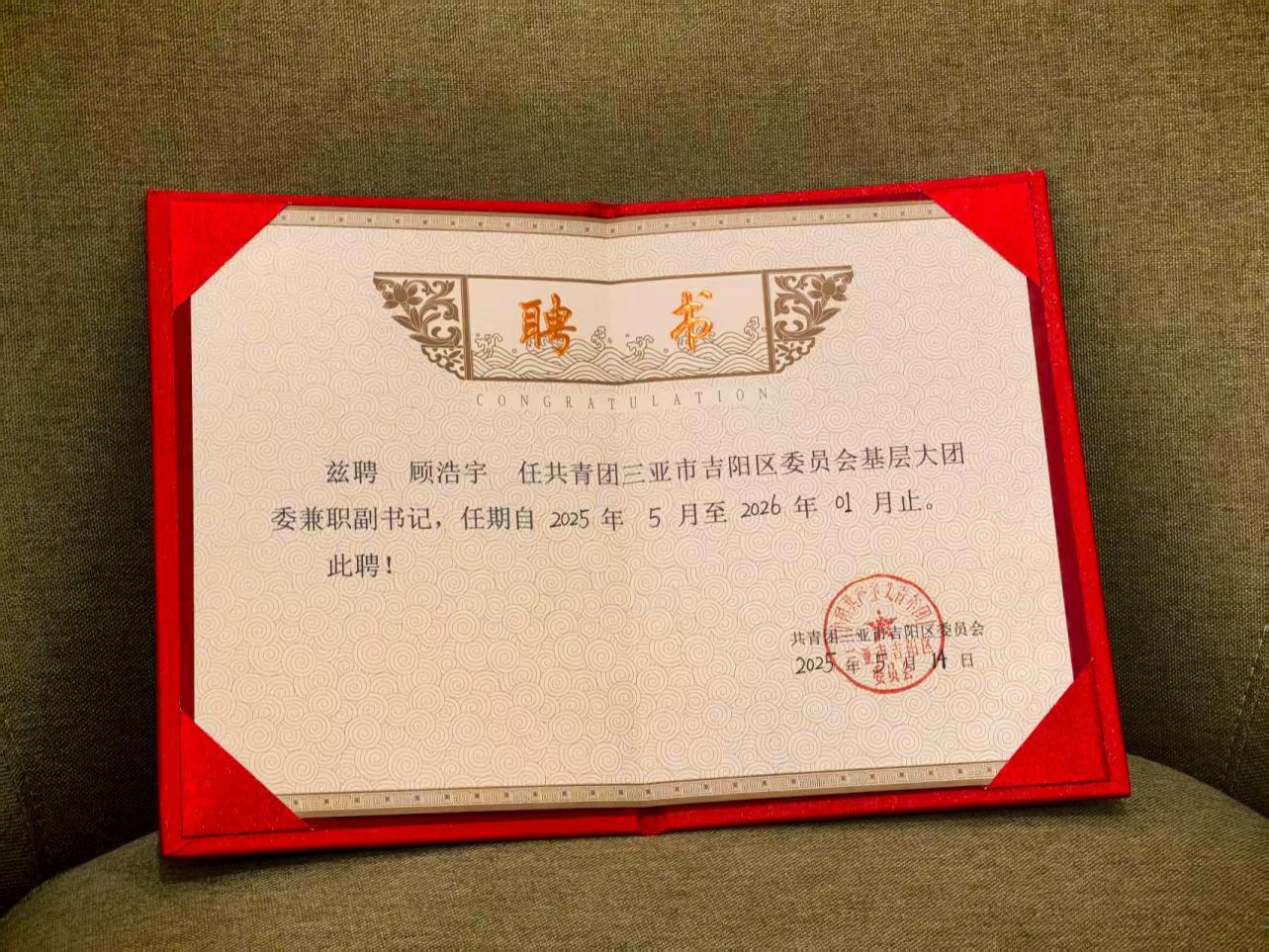 若说校园经历是他成长的“练兵场”,那么社会实践便是他践行责任的“主战场”。如今,顾浩宇还肩负着三亚市吉阳区榆亚大社区基层大团委兼职副书记的职责。这份工作让他走出象牙塔,真正扎根基层:他曾顶着烈日走访社区商户,倾听经营难题;也曾坐在居民议事厅里,耐心记录老人对养老服务的需求;更曾牵头组织政策宣讲会,用通俗语言为居民解读社保新政。“每解决一个小问题,都能感受到沉甸甸的价值”,他始终以行动诠释着基层服务的意义。
