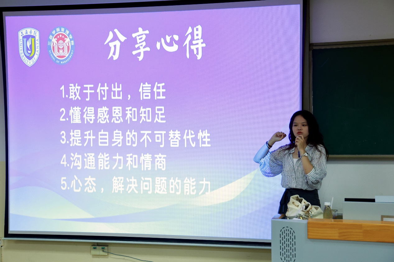 9月17日上午,我院2024届人力资源管理专业优秀毕业生曹颖重返校园,在5西103教室,以自身大学成长与实践经历为蓝本,为新生们带来一场干货满满、温暖走心的分享,助力我院人力资源管理专业及2025级新生们更快融入大学生活,清晰锚定未来奋斗目标。